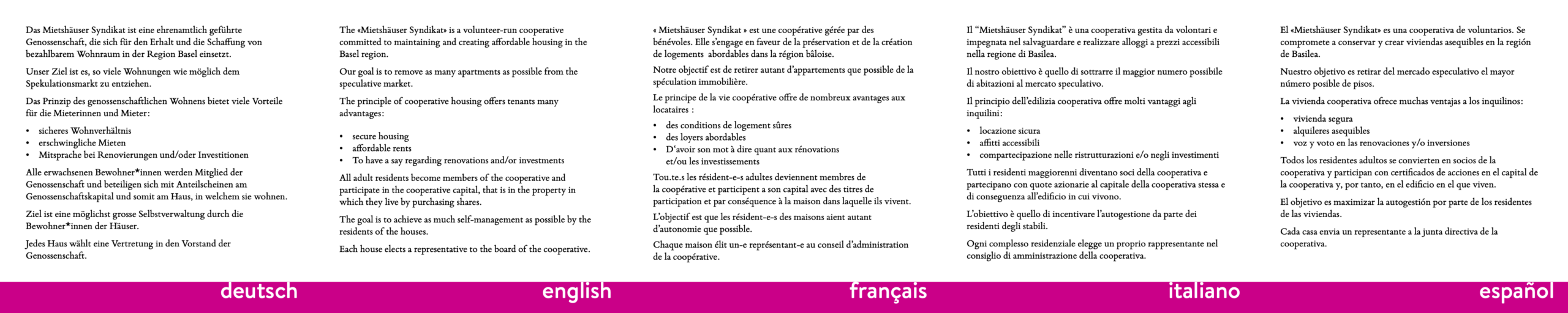 Möglichst viele Häuser sollen durch kollektives Eigentum und Selbstverwaltung nachhaltig der Spekulation entzogen werden. Das Mietshäuser Syndikat (MHS) versteht sich als wohnpolitische Plattform, die Vernetzung fördert, Wissen zur Verfügung stellt und die Zukunft des Basler Wohnungsmarkts aktiv mitgestaltet.